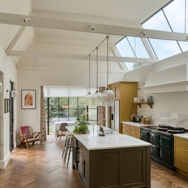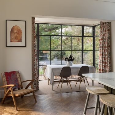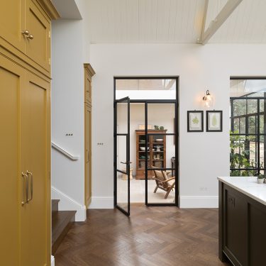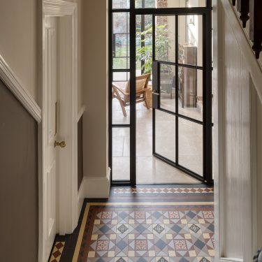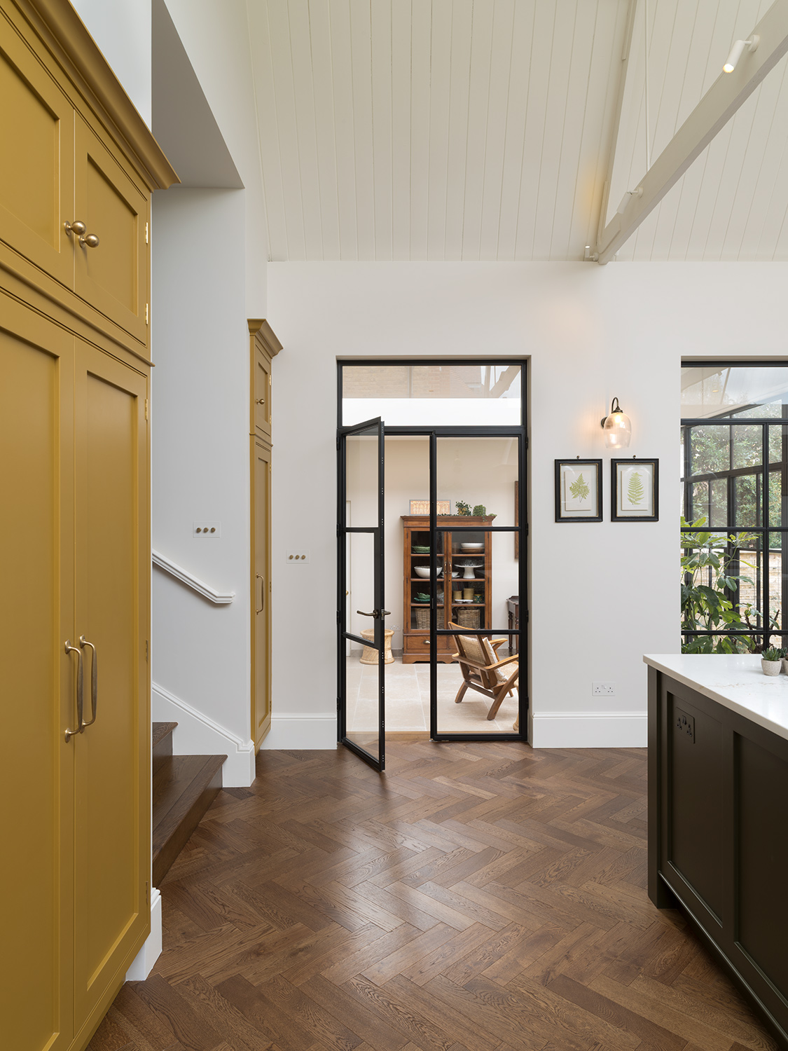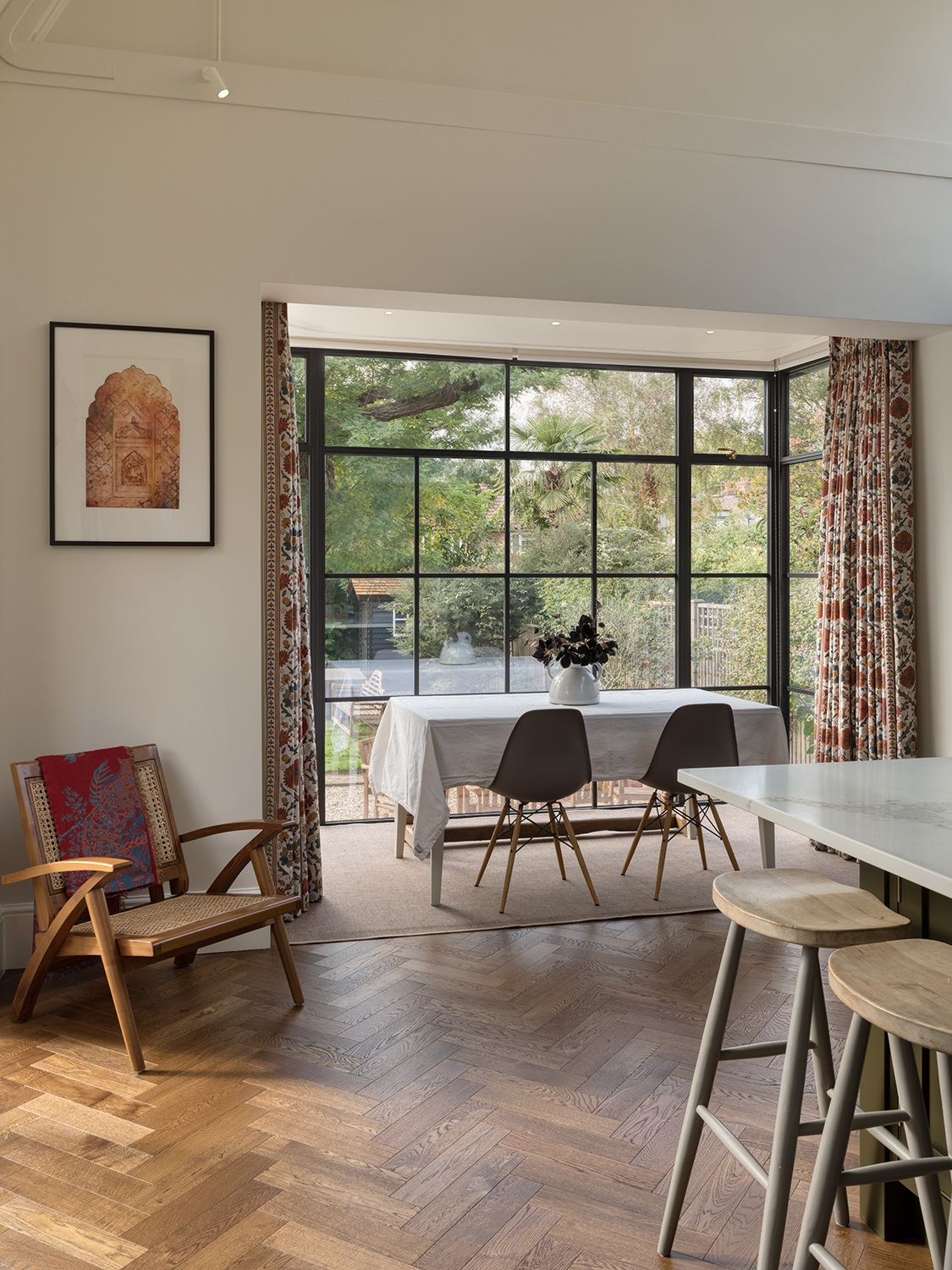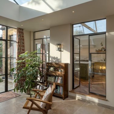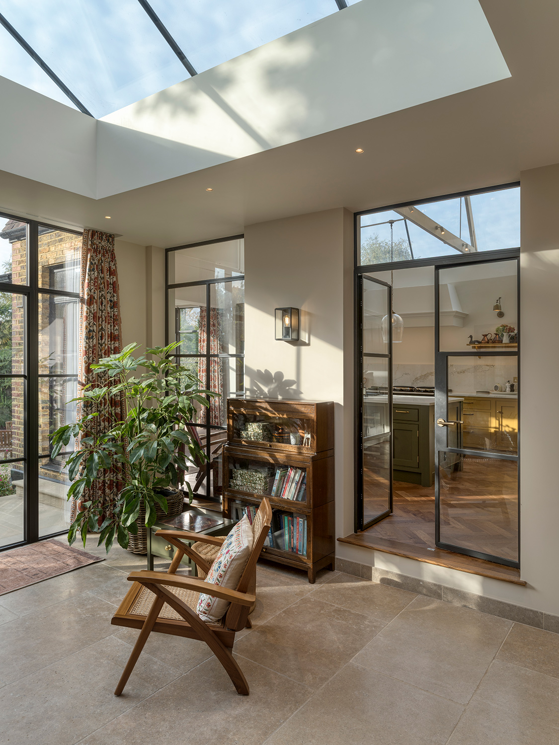 New openings were introduced to improve the connection between internal spaces and to the garden and new stone terraces beyond. All new glazing and doors are steel, Crittall-style, and the fenestration has been carefully designed to achieve a balanced, unified composition.